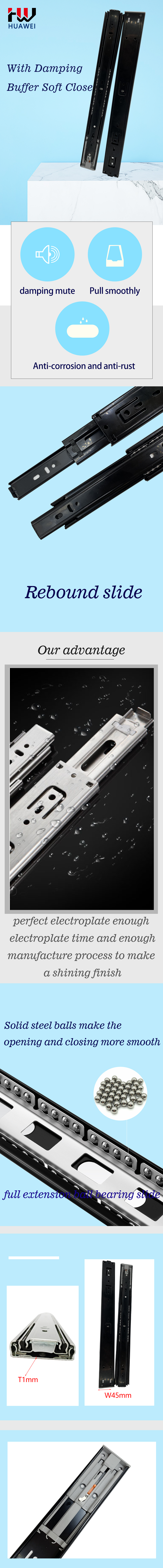 Huawei hardware 45mm Cushioning with Spring Slide Drawer Undermount Slides Full-extension 3 Fold Rebound Style Frame Ball Bearing Rails